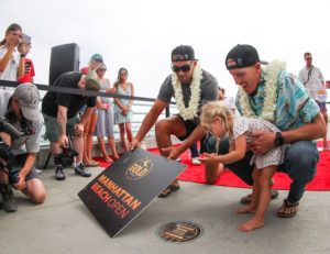 Tri Bourne holds his daughter as he and Trevor Crabb see their plaque on the Manhattan Beach Pier/AVP photo