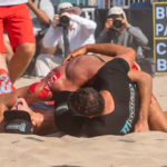 Trevor Crabb and Tri Bourne come together after winning the Manhattan Beach Open//Ed Chan, VBshots.com