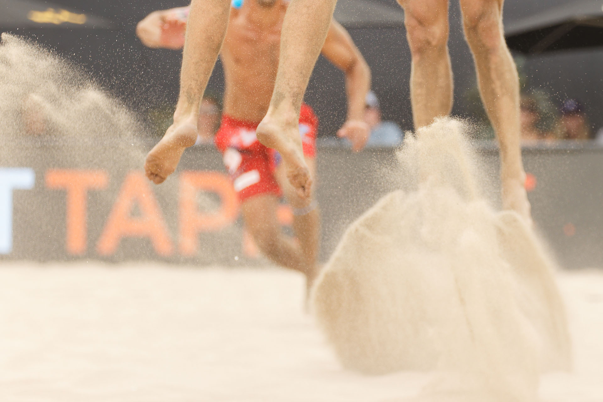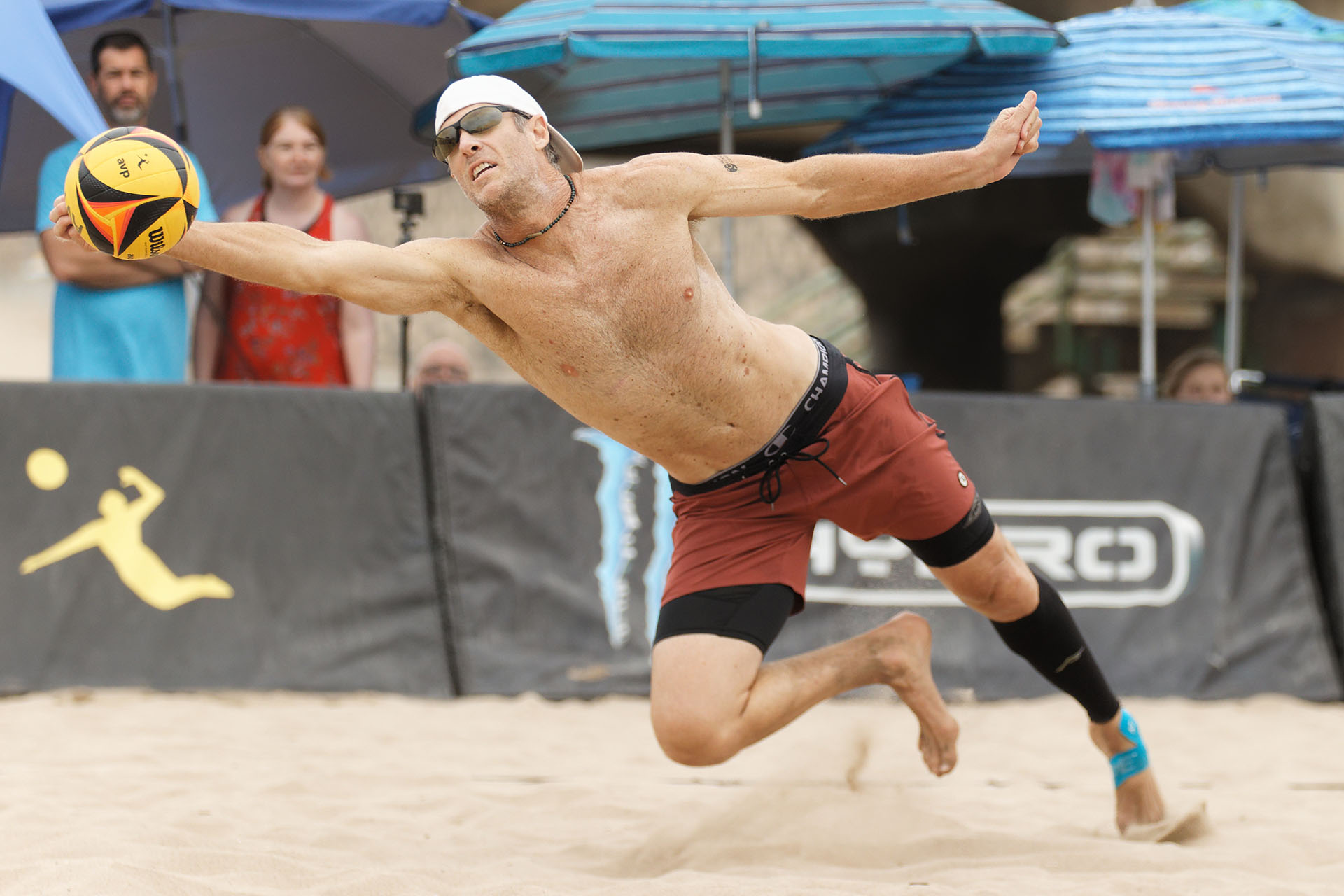 John Hyden digs in a spray of sand/Ed Chan, VBshots.com