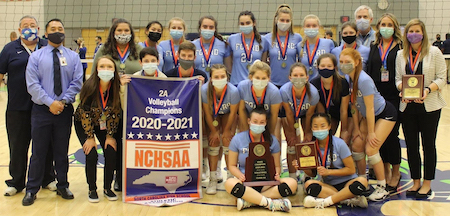 Lee Christian won its first state title, sweeping two-time defending champion Kerr-Vance Academy in the 1A final. Lee Christian had been knocked out of the playoffs the past two seasons by KVA and the school’s five seniors were determined not to suffer the same fate in their final year. The Falcons held Kerr-Vance below 20 points in each of the three sets.