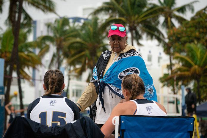FIU coach Rita Buck Crockett talking to her team during a time out