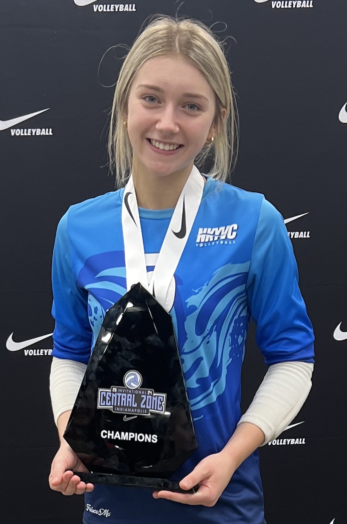 OH: Kate Kalcynski, 6-0 Fr., Legacy 15-1 Adidas (MI) – Kalcynski led the Central Zone 15 Open champs in kills, passer rating, hitting percentage and solo blocks, a performance that coach Tyler Strom described as “absolutely incredible.”