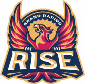 The franchise in Grand Rapids is going to be called the Rise. The logo features a fiery phoenix, with talons gripping the word Rise set in front of a glowing sun beneath Grand Rapids.