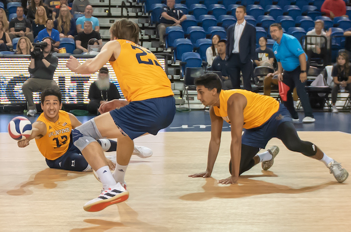 UCI beat CSUN 25-21, 25-22, 25-18 and hit .405 with eight aces, four by Hilir Henno and three by Francesco Sani, and 14 errors. Henno led with 12 kills and also had an assist an a dig. Sani had nine kills and added an assist, two blocks and a dig. Joe Karlous had 31 assists and six digs.