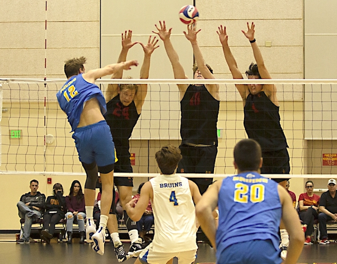 MPSF — UCLA (16-3, 6-1) overpowered USC (17-5, 4-3) 25-23, 25-19, 25-17, seemingly going stronger as the match progressed. The Bruins, who hit .364 with six aces and 16 serving errors, got 14 kills from Kevin Kobrine. Kobrine had one error in 22 attacks and hit .591 to go with an ace, five digs and two blocks, one solo. Ethan Champlin had nine kills with one error in 16 attacks, two assists, an ace, a block and four digs. Alex Knight had six kills but hit .000 and added an ace and 11 digs. Miles Partain had three kills, 32 assists, two aces, a block and four digs.Â