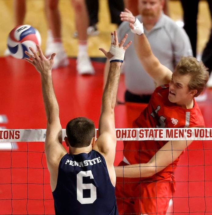 Penn State (2-0) of the EIVA came away with a 25-20, 25-17, 23-25, 25-21 victory at Ohio State (1-1) of the MIVA behind a career-best 21 kills from John Kerr. He had three errors in 45 attacks to hit .545 and had an assist, an ace, five blocks and four digs. Kerr’s previous high was the six kills he had against Central State in the season opener. Penn State played without leading attackers Bret Wildman and Cal Fisher. The Nittany Lions hit .347 and had six aces and 21 serving errors. Cole Bogner had four kills in five errorless tries, 42 assists, an ace, a block and six digs. Ohio State hit .213 and had four aces and 17 errors. Jacob Pasteur had 13 kills, an ace, two blocks and two digs …