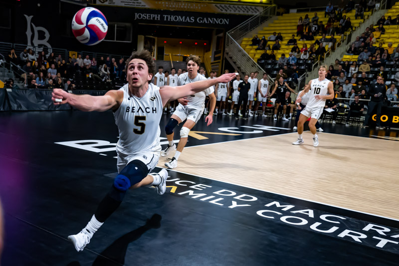 Long Beach libero Mason Briggs steps in to pass in front of Skyler Varga/Jim Wolf photo