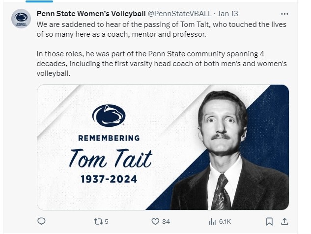 On the X social-media site (formerly Twitter) the Penn State men’s and women’s programs acknowledged Tait’s passing with these words: “We are saddened to hear of the passing of Tom Tait, who touched the lives of so many here as a coach, mentor and professor. In those roles, he was part of the Penn State community spanning four decades, including the first varsity head coach of both men’s and women’s volleyball.”