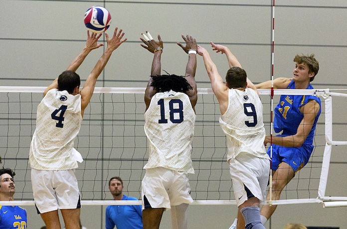 UCLA (15-4) of the MPSF battled to a 25-20, 21-25, 22-25, 25-21,15-12 victory over Penn State (13-6) of the EIVA at USC. Ethan Champlin led the Bruins with 15 kills and hit .500 after having just three errors in 24 attacks to go with three assists and six digs. Cooper Robinson had 11 kills, hit .450, and had an assist, a block and two digs. UCLA hit .327 and had eight aces and 26 errors. Penn State, which hit .275 and had nine aces and 25 errors, got 19 kills from John Kerr. He added an assist, two of those aces and five digs. Michael Valenzi had 10 kills, an assist, two aces, six digs and two blocks, one solo ..