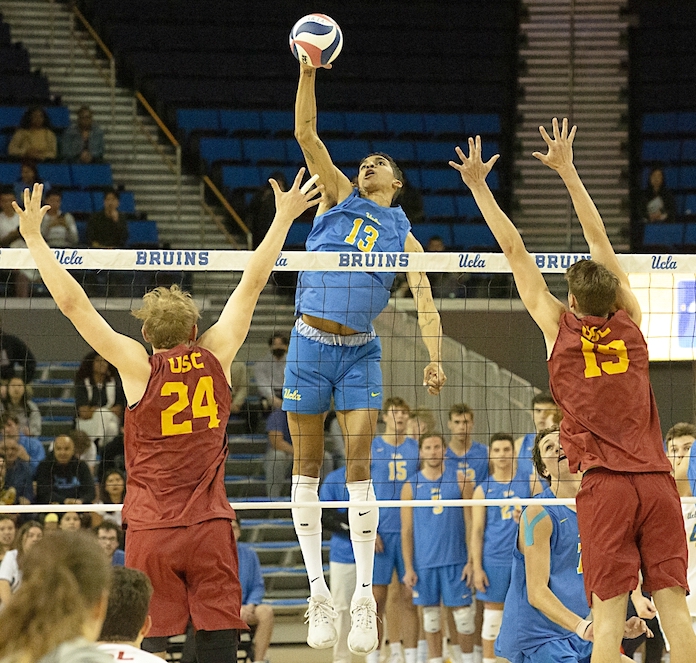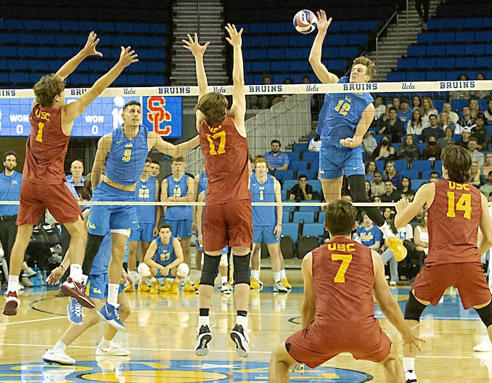 Alex Knight led UCLA with 12 kills and hit .500 after having one error in 22 attacks. He had four blocks and six digs. Merrick McHenry had 10 kills, hit .467, and had an assist, a solo block and three digs. Andrew Rowan had two kills in three errorless tries, 31 assists, two aces, three blocks and two digs. His team hit .263 and had seven aces and 15 serving errors. USC hit .208 and had two aces and 17 errors. Dillon Klein and Lucas Frassrand had seven kills each …Â