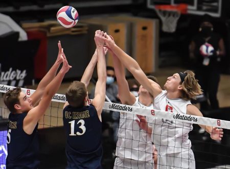 MEN — The Big West had two matches as Long Beach State (1-1) bounced back with a four-set win against visiting UC Santa Barbara (5-4, 3-1) after losing in four to the Gauchos on Saturday. Five LBSU players had 11 or more kills, 16 by Spencer Olivier, who hit .333 and had two assists, 17 digs, and five blocks, three solo. Aidan Knipe had three kills in as many tries, 57 assists, and five digs. UCSB’s Randy DeWeese had 17 kills, an assist, an ace, two blocks, and five digs … CSUN (1-1) got a split with UC Irvine (2-6, 2-2) by winning in four as four players had 11 kills or more. Kyle Hobus led with 15 as he hit .444 and had three assists, an ace, and six digs. Joel Schneidmiller had 13 kills for UCI …