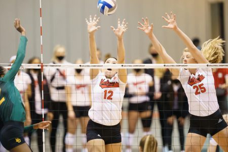Holly Carlton had seven kills, five blocks, and seven digs. Lauren Forte had six kills and seven blocks, and Lauren Dooley had four kills with no errors in eight attacks and eight blocks. Elli McKissock had 19 digs and four assists.