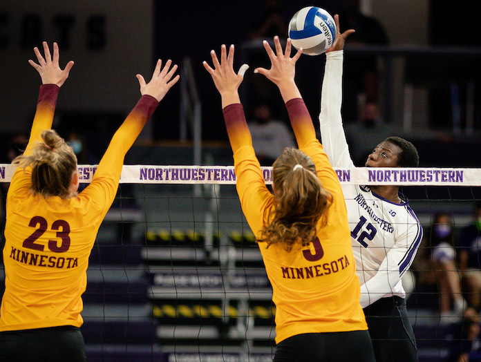 BIG TEN — Northwestern (6-9, 1-3) was so close, rallying with four points in a row to take a 24-23 lead in the fourth, but ultimately fell to Minnesota (8-4, 3-1) 24-26, 19-25, 25-18, 31-29, 15-7. Stephanie Samedy had 23 kills, seven digs, and five blocks, two solo for the Gophers, and Taylor Landfair had 20 kills with one error in 39 attacks, three digs, and five blocks, three solo. Minnesota hit .182, and Northwestern .172. Temi Thomas-Ailara had 21 kills for the Wildcats plus an ace, 16 digs, and four blocks, one solo …