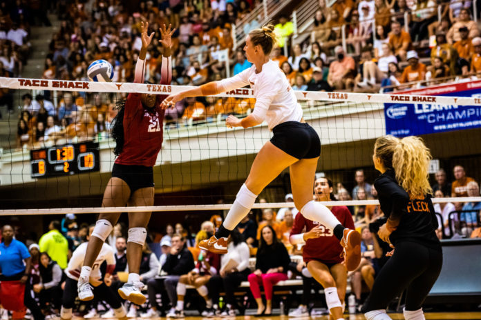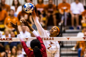 BIG 12: Texas (10-0) hit .325 and swept visiting Oklahoma (10-3). Asjia O’Neal had 13 kills, hit .647 and had an ace and two blocks. Logan Eggleston had eight kills but hit .071. She had three aces and eight digs …Â TCU (6-7) beat visiting Iowa State (8-6) n four behind 18 kills by Audrey Nalls, who hit .333 and had three assists, two aces, 11 digs and a block … Texas Tech (12-2) won came back from losing the first two sets and won in five at West Virginia (6-7). Four Red Raiders had 10 or more kills, 16 by Kenna Sauer, who had 22 digs and four blocks, two solo. WVU’s Adrian Ell had 24 kills, 15 assists, an ace, 10 digs and a block … Kansas (11-3) won in five at Kansas State (9-5). London Davis had 22 kills in 34 errorless attacks to hit .647 to go with four digs and three blocks.