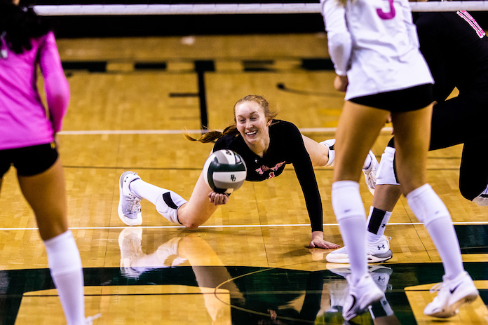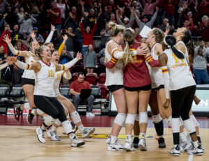 Iowa State’s Eleanor Holthaus led with 14 kills, an ace, a block and 11 digs. Annie Hatch had 14 kills and a block, Maya Duckworth had 14 kills, two aces, a block and seven digs, and Solei Thomas had 11 kills, an assist, two blocks and three digs. Kelsey Perry had seven kills in 10 errorless attacks and two blocks. Brooke Stonestreet had 25 digs, eight assists and two aces.