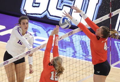 NM State (15-5, 6-2) scored a big sweep of SFA (13-5, 4-2). NM State, a game back of idle Utah Valley in the West Division, got 22 kills from Katie Birtcil, who hit .432 after having three errors in 44 attacks. She added 12 digs. SFA, which was in a three-way tie for first in the West, got nine kills from Leah Powell, who had an ace, a solo block, and nine digs … also in the WAC, Grand Canyon (13-4, 5-3) swept visiting Sam Houston (11-7, 4-2), which was one of those three teams in the West, leaving idle UTRGV atop the Southwest. GCU, which has won 17 in a row at home, got 12 kills from McKenzie Wise …