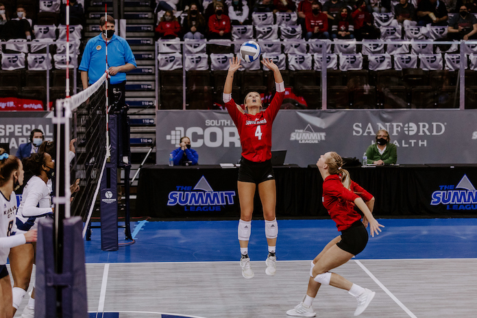 Madison to Madison: Madison Jurgens sets South Dakota teammate Madison Harms in the Summit League tournament against Kansas City/Molly Sheppard, USD photo