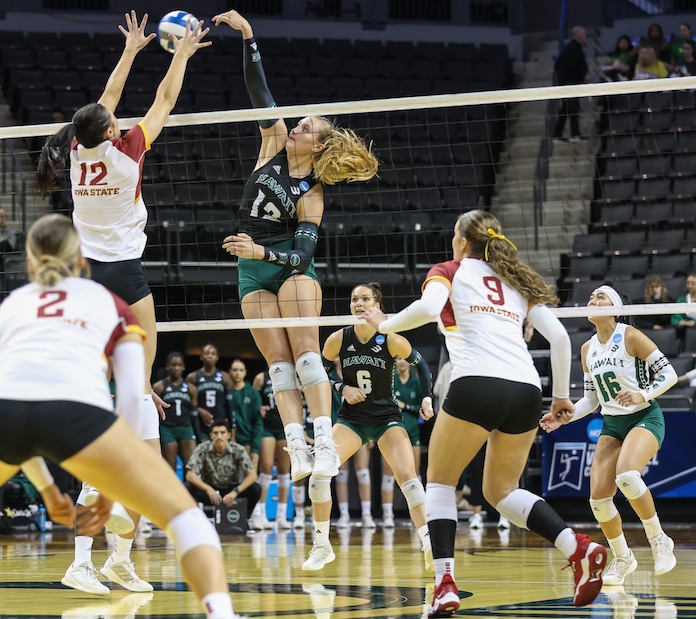 Big West-champion Hawai’i (24-8) battled to a 16-25, 26-24, 25-18, 25-23 win over seventh-seeded Iowa State (20-10) of the Big 12. Caylen Alexander led the Rainbow Wahine with 18 kills, an assist, an ace, a block and six digs. Amber Igiede had 14 kills with one error in 35 attacks to hit .371 and had an assist, four digs and four blocks. Kennedi Evans had six kills and seven blocks, one solo, and Tali Hakas had six kills with one error in 19 attacks, five blocks and 14 digs.Kate Lang had 45 assists, ana ce, three blocks and 13 digs. Iowa State’s Maya Duckworth had 15 kills, an assist, five of her team’s eight aces, 11 digs and two blocks, one solo. Alexis Engelbrecht had 13 kills, hit .478, and had an assist, six digs and two blocks, one solo …