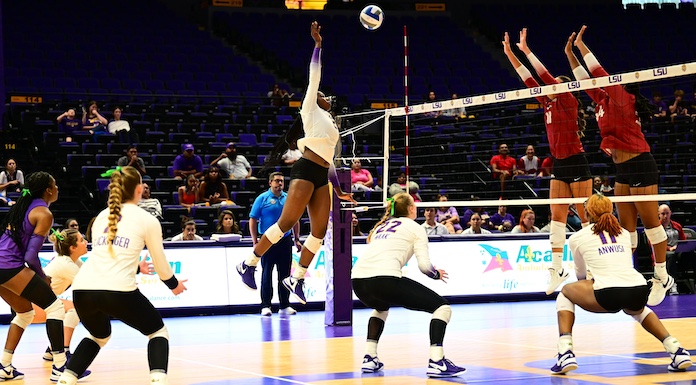 Arkansas (14-2, 4-0 SEC) won its 12th match in a row since losing back-to-back to Wisconsin the last two days of August. The visiting Razorbacks hit .343 and overpowered LSU (7-7, 2-2) 25-20, 25-19, 25-20. Jillian Gillen had 15 kills with two errors in 31 attacks to hit .419. She had seven kills with no errors in 11 swings in the third set and finished with three aces, six digs and two blocks, one solo. Taylor Head had 14 kills, an ace, a solo block and 14 digs. Courtney Jackson had 12 digs, three assists and an ace and setter Hannah Hogue had a kill in four errorless tries, 38 assists, three aces, six digs and a block. LSU’s Jurnee Robinson had 16 kills, an assist, an ace and six digs. Gillen leads the SEC at 4.21 kills per set and Robinson is second at 4.18 …