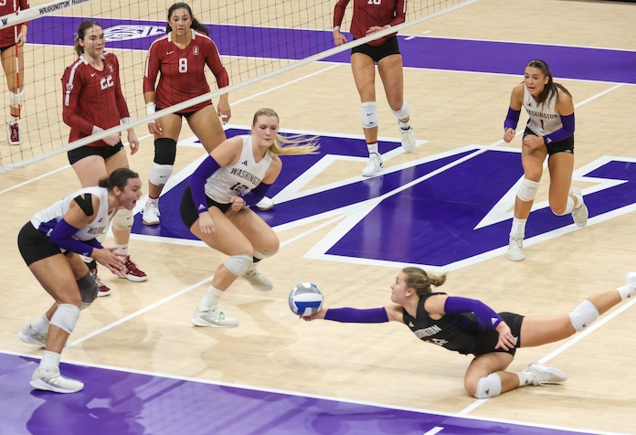 PAC-12: No. 3 Stanford (12-2, 5-0) had to work four sets to dispatch inury-depleted Washington (10-6, 1-4) before a crowd of 3,740 in Alaska Airlines Arena. Hitting at a robust .402 clip, the visiting Cardinals were led by Kendall Kipp’s .514 (21 kills with three errors on 35 swings). Ella Rubin chipped in 12 kills and 10 digs. … No. 4 Washington State (15-1, 5-0) outscored visiting Cal (12-4, 1-4) 75-50 over three sets, much to the pleasure of 1,751 at Bohler Gym. The Cougars hit .417 and cranked eight aces. Middle hitter Magda Jehlarova picked up 10 kills on .500 hitting and four service winners. … A balanced attack with three hitters in double-digit kills, paced by Gabby Gonzales’ 13, propelled No. 5 Oregon (14-2, 4-1) in a sweep at Colorado (9-7, 1-4). The Ducks’ Kara McGhee was the picture of near-perfection with 10 kills on 11 errorless swings, along with 6 blocks (one solo). …