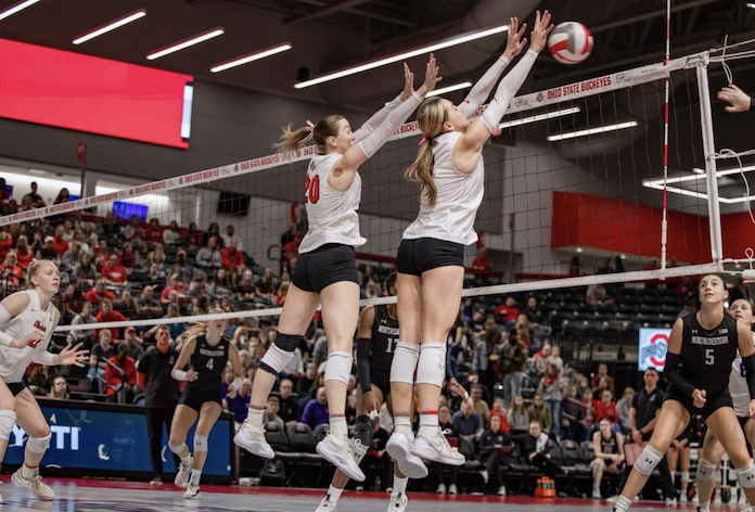 Ohio State’s Rylee Rader, left, and Mia Tuman block Northwestern/Ohio State photo