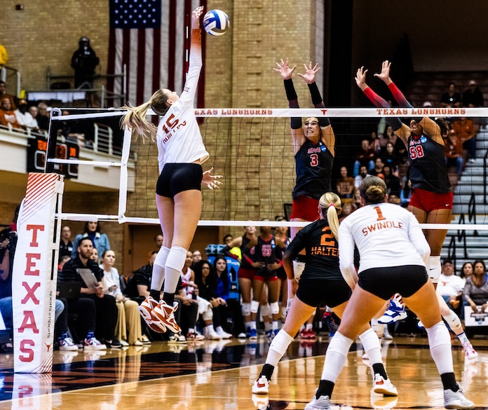 Texas (24-4) hit .446 and is in the round of 16 for the 18th year in a row after its 25-16, 25-14, 25-17 whitewash of SMU (26-7). Madisen Skinner led with 21 kills and hit .486 after having three errors in 37 attacks to go with two aces, three blocks and six digs. Jenna Wenaas had 10 kills and hit .421 and Molly Phillips had six kills with no errors in 11 swings and Asjia O’Neal had six kills in 15 errorless attacks. O’Neal had five blocks, one solo. SMU’s Niya Shime had 13 kills …