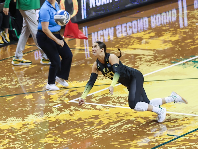Oregon (28-5) fell behind by seven points in the first set and then made short work of Hawai’i (24-9) by sweeping 25-23, 25-12, 25-17. Oregon, in the round of 16 for back-to-back seasons for just the second time, got 14 kills in 21 errorless attacks from Morgan Lewis. She had two blocks, one solo. Hannah Pukis had two kills in four errorless tries, 29 assists, an ace, three blocks and seven digs. Hawai’i, which hit .061 got 13 kills from Caylen Alexander.