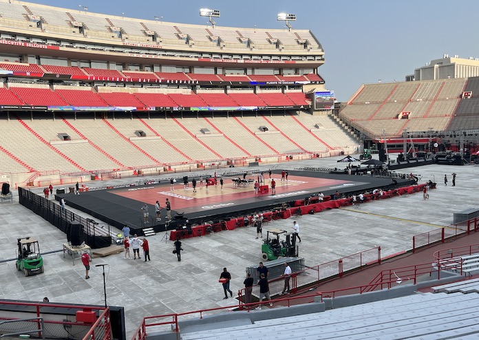 Nebraska announced the game six months ago, and administrators began figuring out how to put a volleyball court in the middle of a football stadium. Because of the crown of the field, it couldn’t be placed directly on the turf.