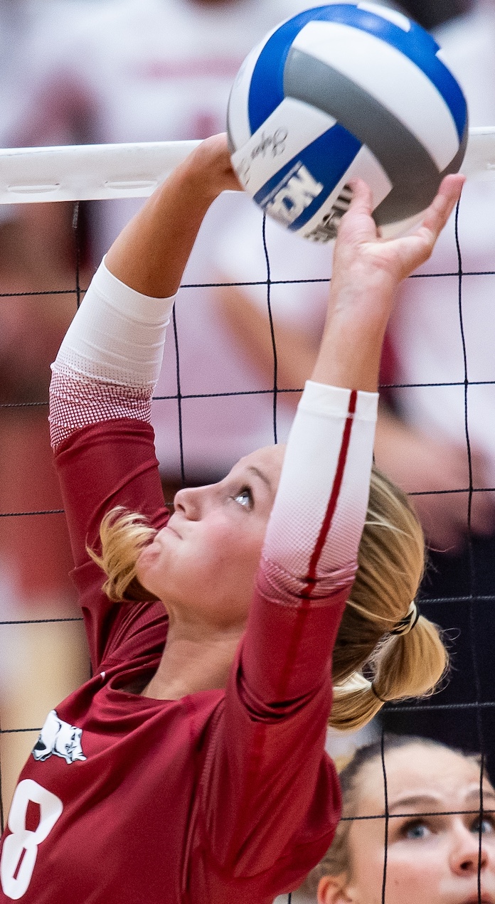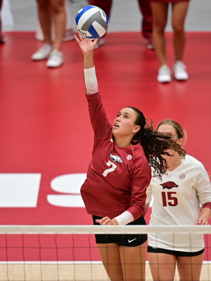 Hogue, the junior from Fort Smith, Arkansas, about an hour south of Fayetteville, is averaging 11.25 assists per set, is tied with Gillen with 28 aces (Head has 26) and averages 2.31 digs and has 21 blocks.