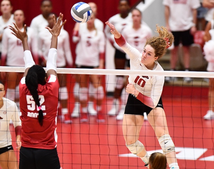 Gillen, the fifth-year outside from Stillwell, Kansas, a suburb of Kansas City, had 15 kills with two errors in 31 attacks to hit .419. She had an ace, six digs and two blocks, one solo. For that matter — and remember, she’s 5-7 — she has 24 blocks, six solo.