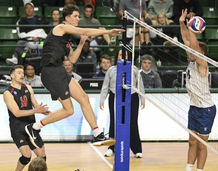 Shane Wetzel had 11 kills, hit .304, and had an assist, four blocks and six digs. Jack Stevens had seven kills, an assist, Ohio State’s only ace, three blocks and five digs. Justin Howard added five kills, four blocks and a dig. Setter Michael Wright had two kills in three errorless tries, 43 assists, two blocks and five digs. His team hit .310 and had 14 serving errors. Thomas Poole added 10 digs and an assist.