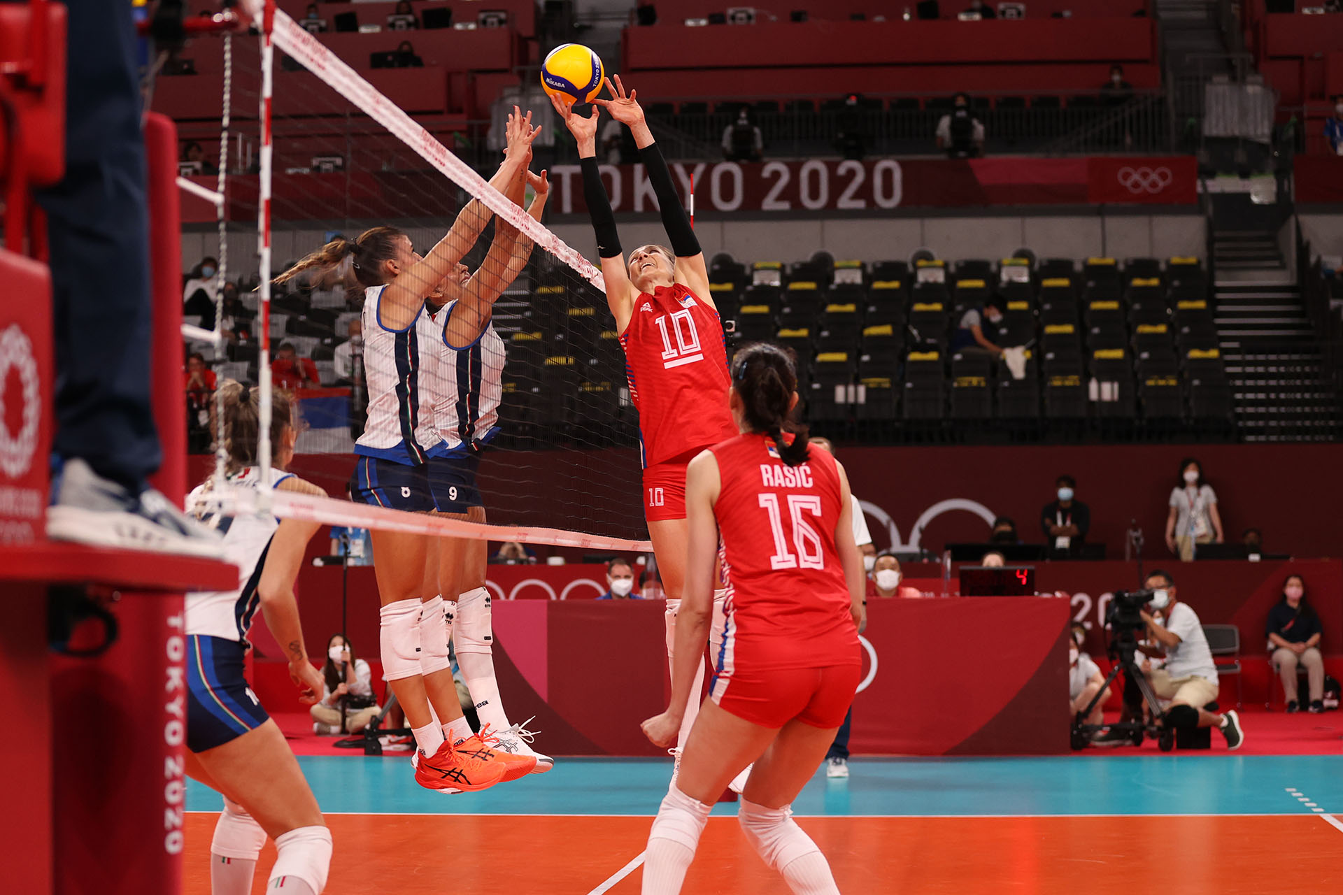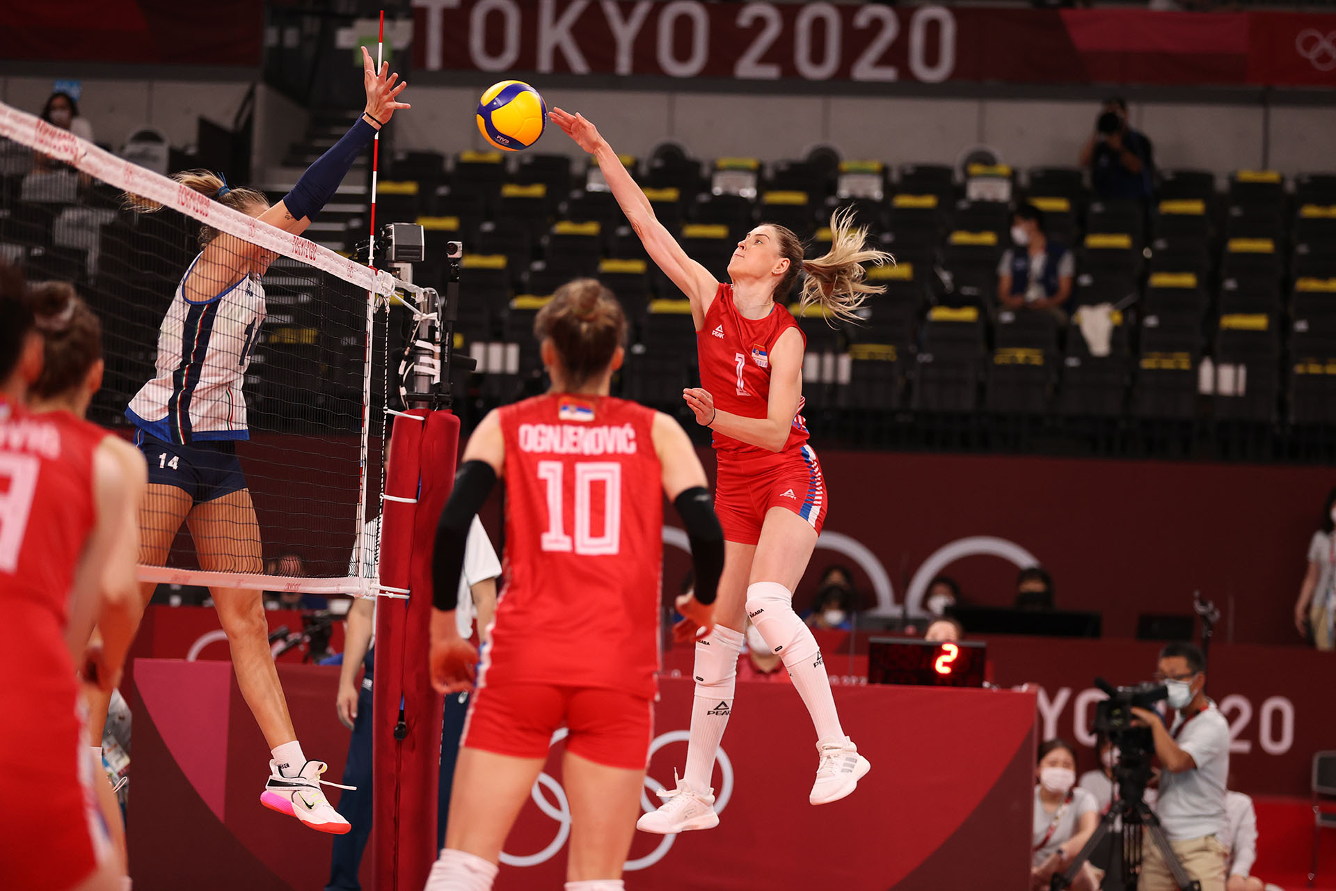 Serbia setter Maja Ognjenovic sets a tight pass while Italy looks to block/Ed Chan, VBshots.com