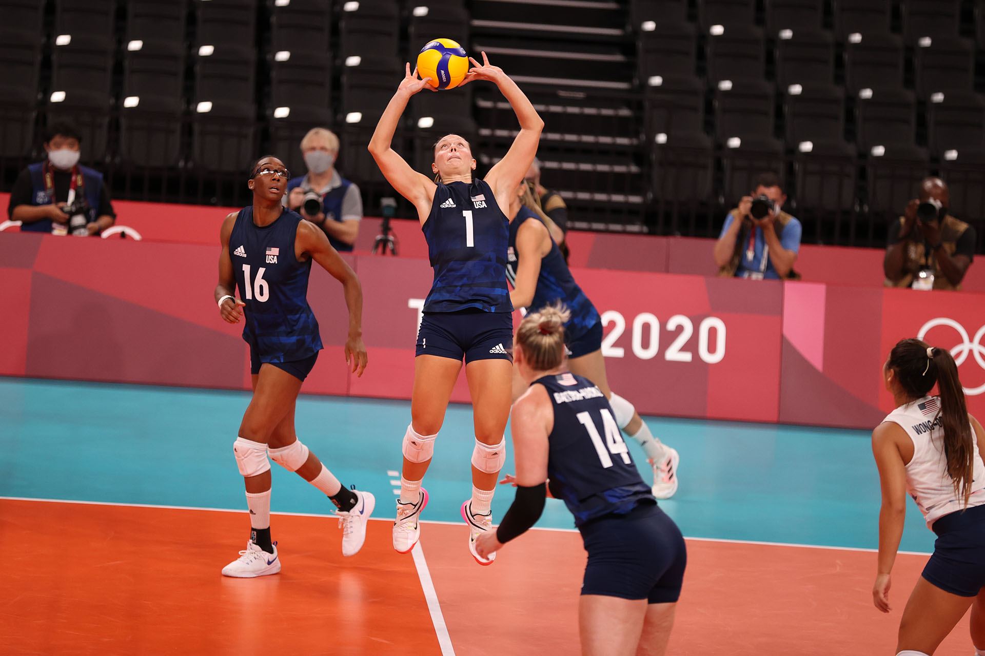Micha Hancock directs the USA offense/Ed Chan, VBshots.com