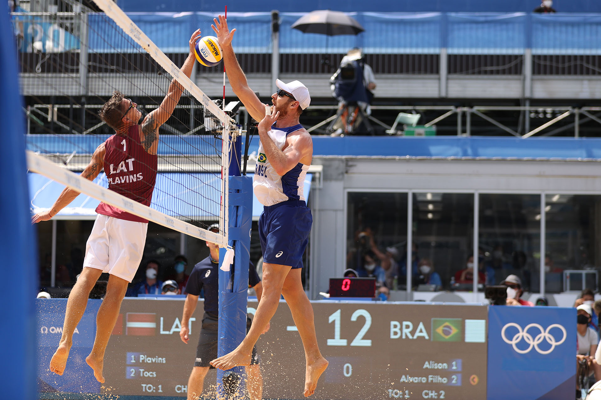 Latvia’s Martins Plavins wins this joust against Brazil’s Alison Cerutti/Ed Chan, VBshots.com