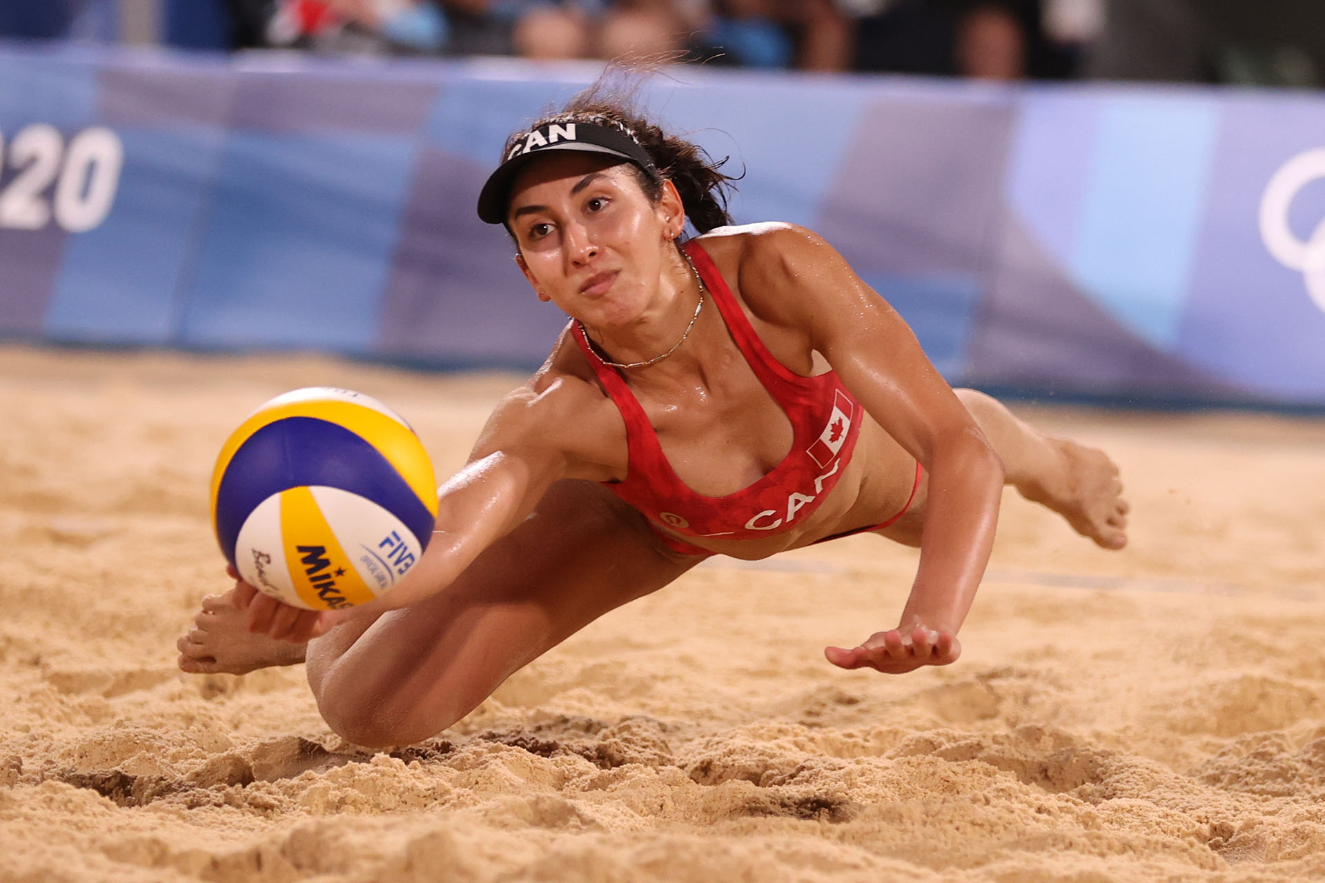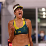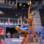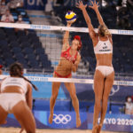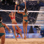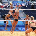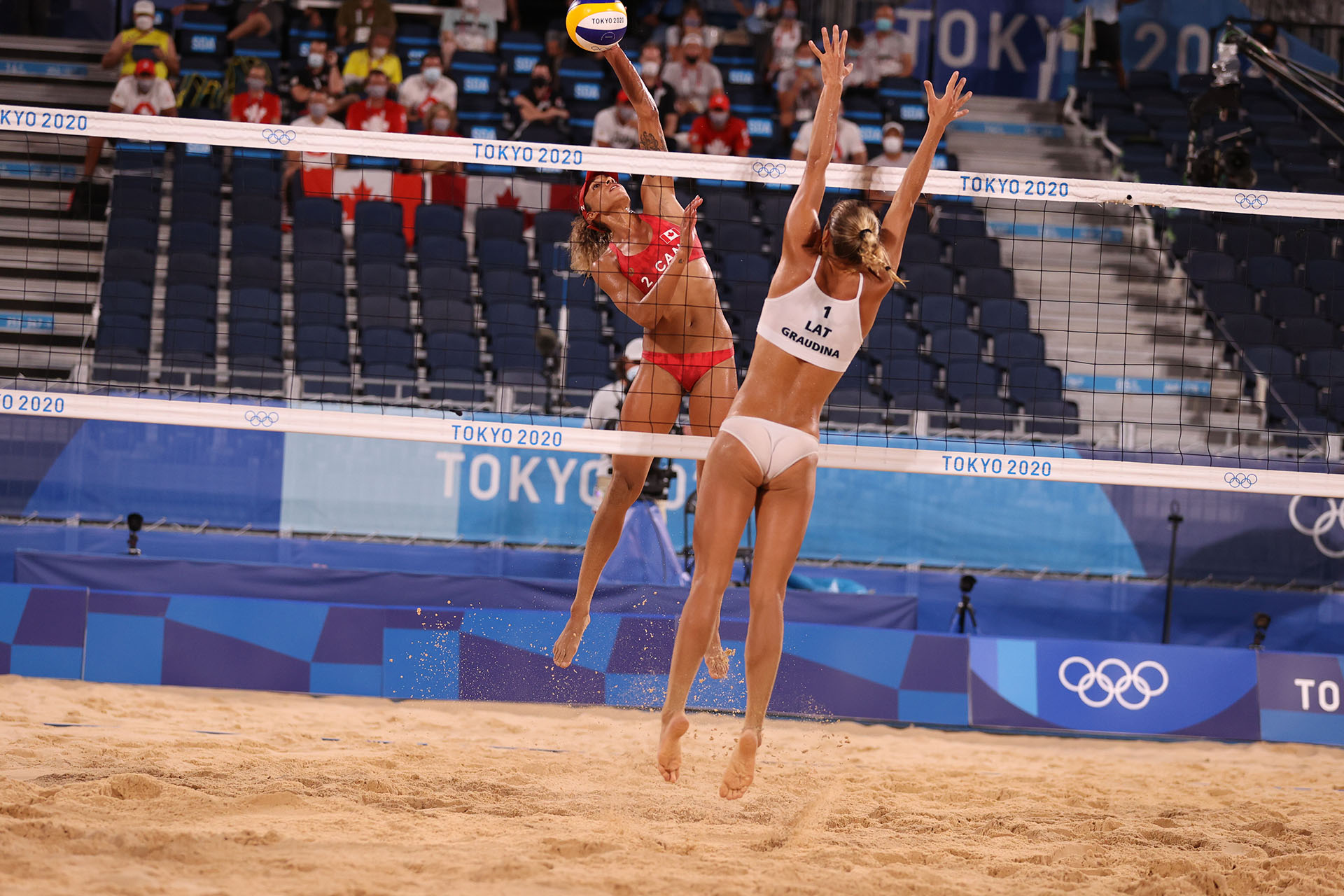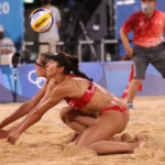 Canada’s Sarah Pavan celebrates an Olympics points with Melissa Humana-Parades last summer in Tokyo/Ed Chan, VBshots.com