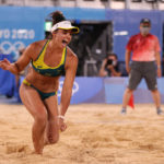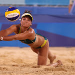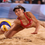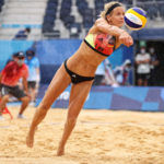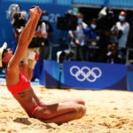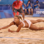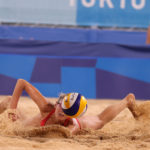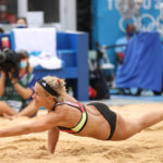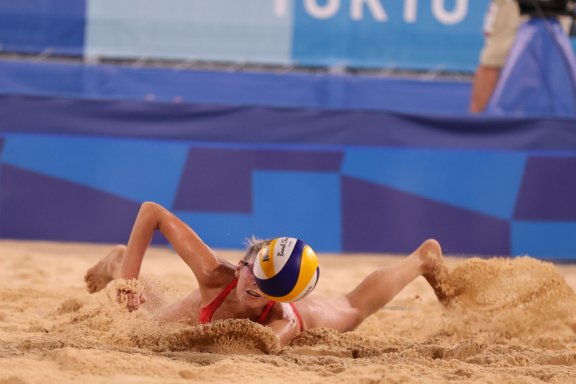 Switzerland’s Anouk Verge-Depre uses the sand to dry off in the humid Tokyo conditions/Ed Chan, VBshots.com