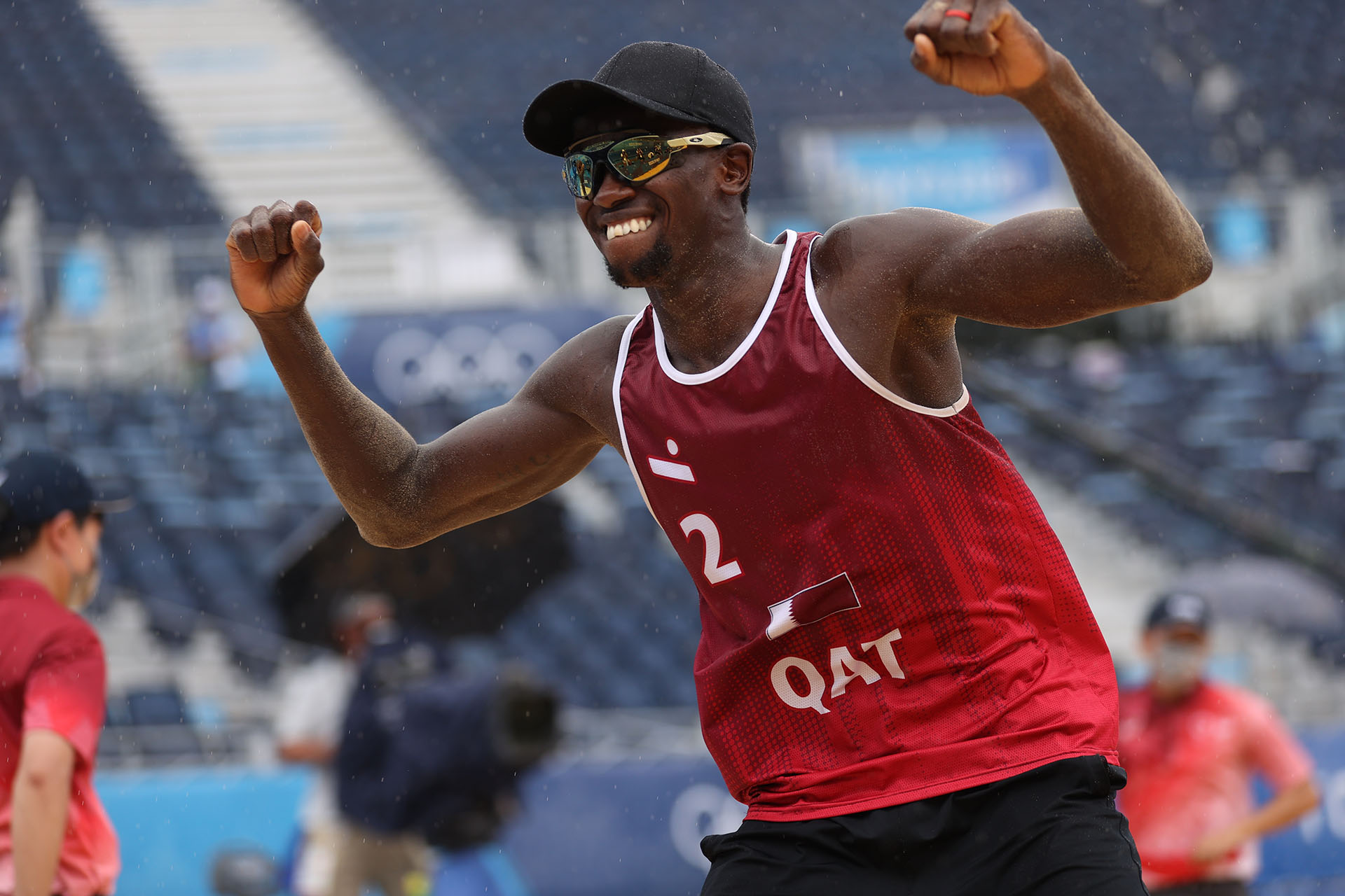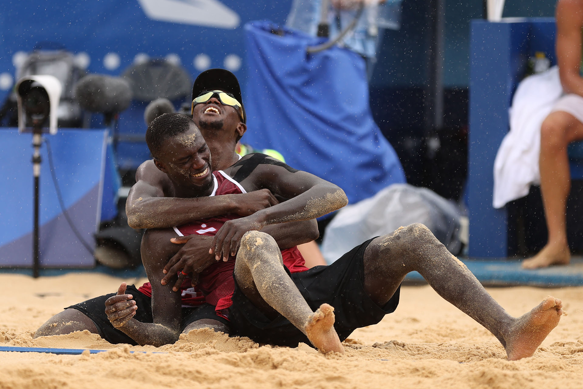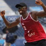 Qatar’s Ahmed Tijan and Cherif Samba celebrate their country’s first medal in beach volleyball in the rain/Ed Chan, VBshots.com