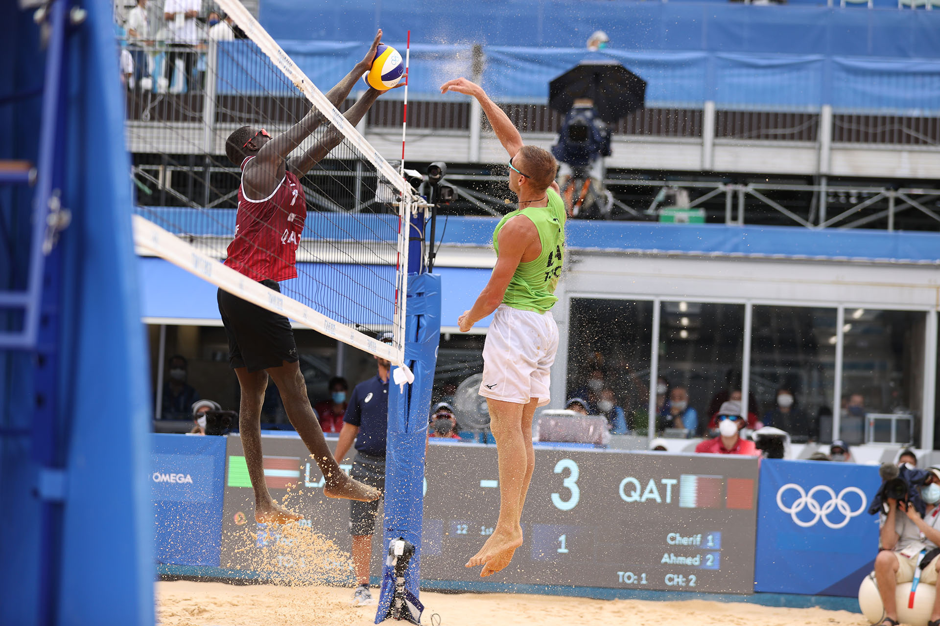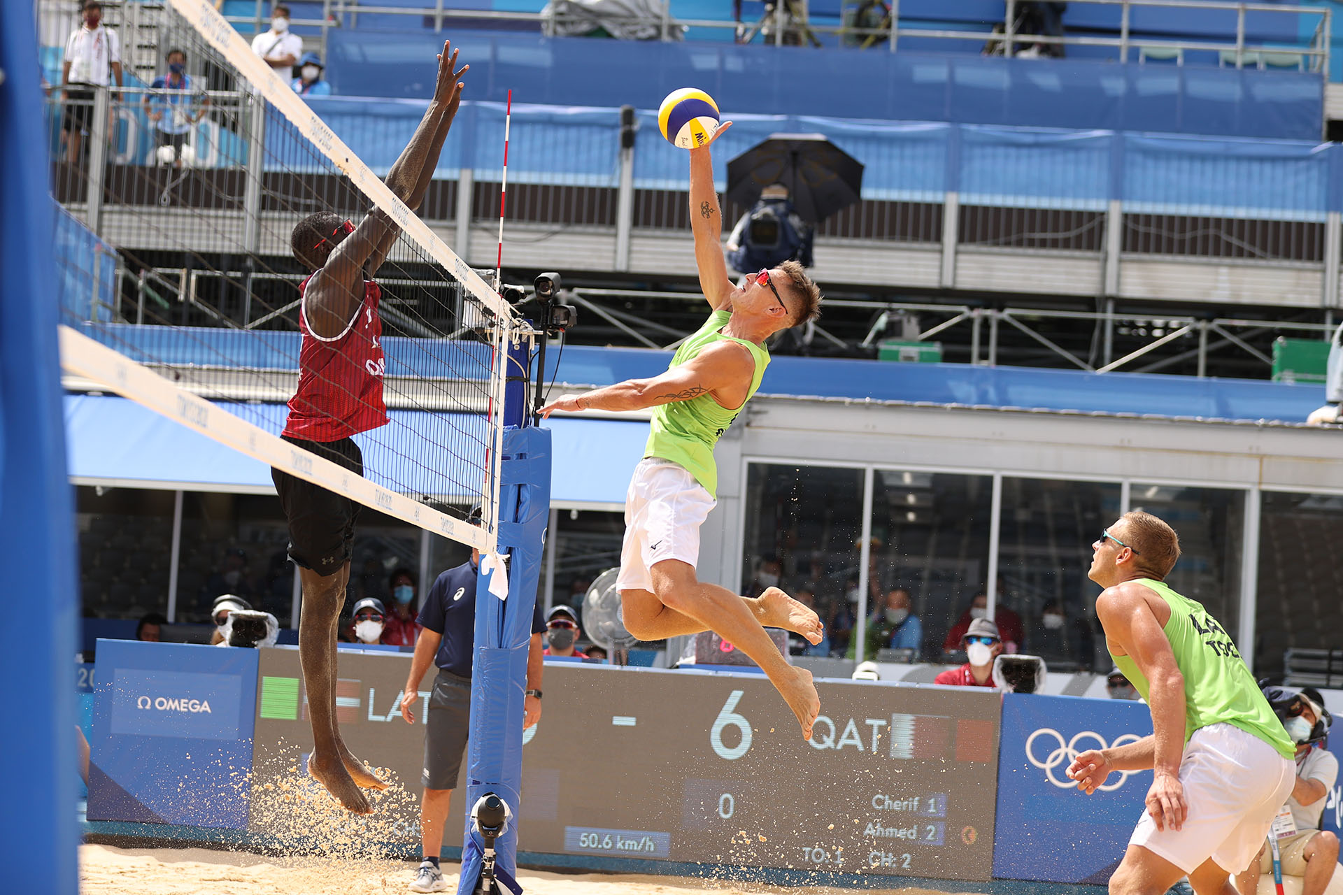Latvia’s Edgars Tocs turns back a Cherif Samba spike/Ed Chan, VBshots.com