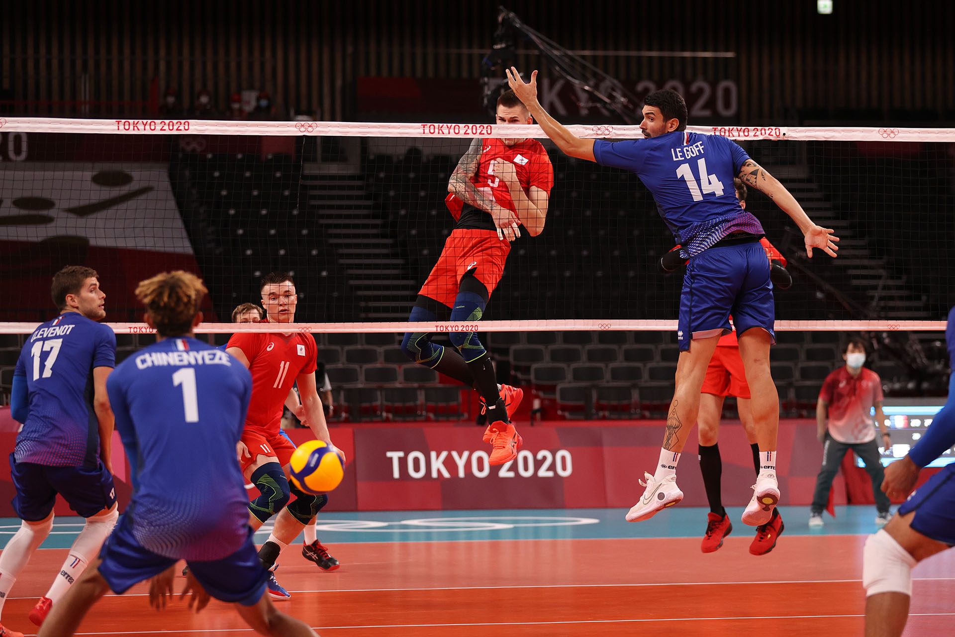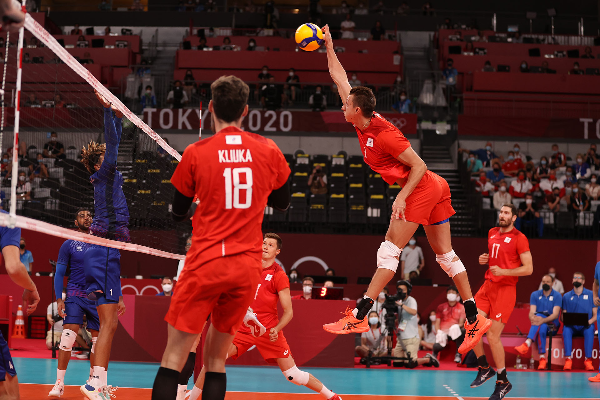 Egor Kliuka lowers his hands to avoid being tooled but Earvin Ngapeth hits into the open court/EdChan, VBshots.com