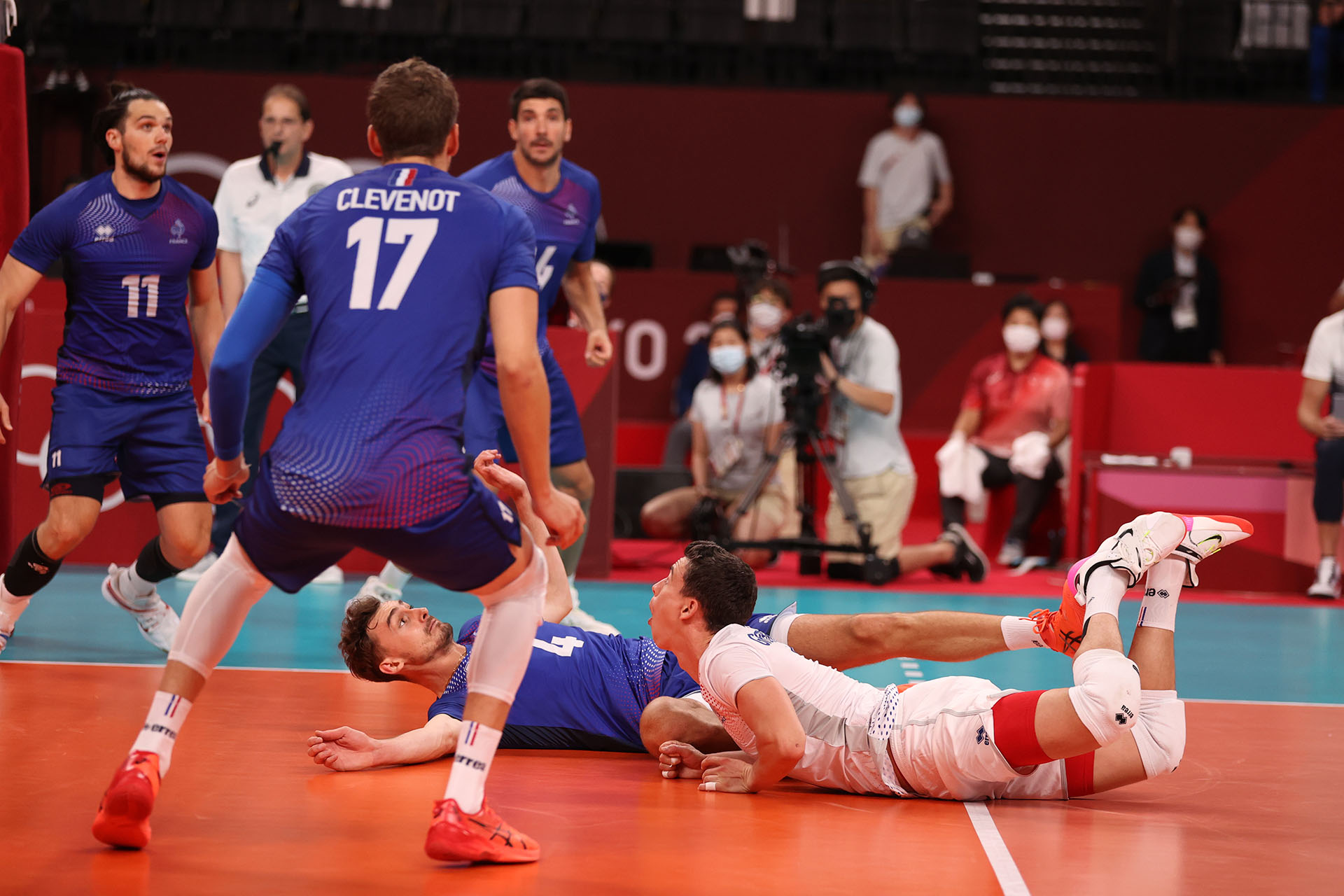 France’s Jenia Grebennikov pancakes a tipped ball/Ed Chan, VBshots.com