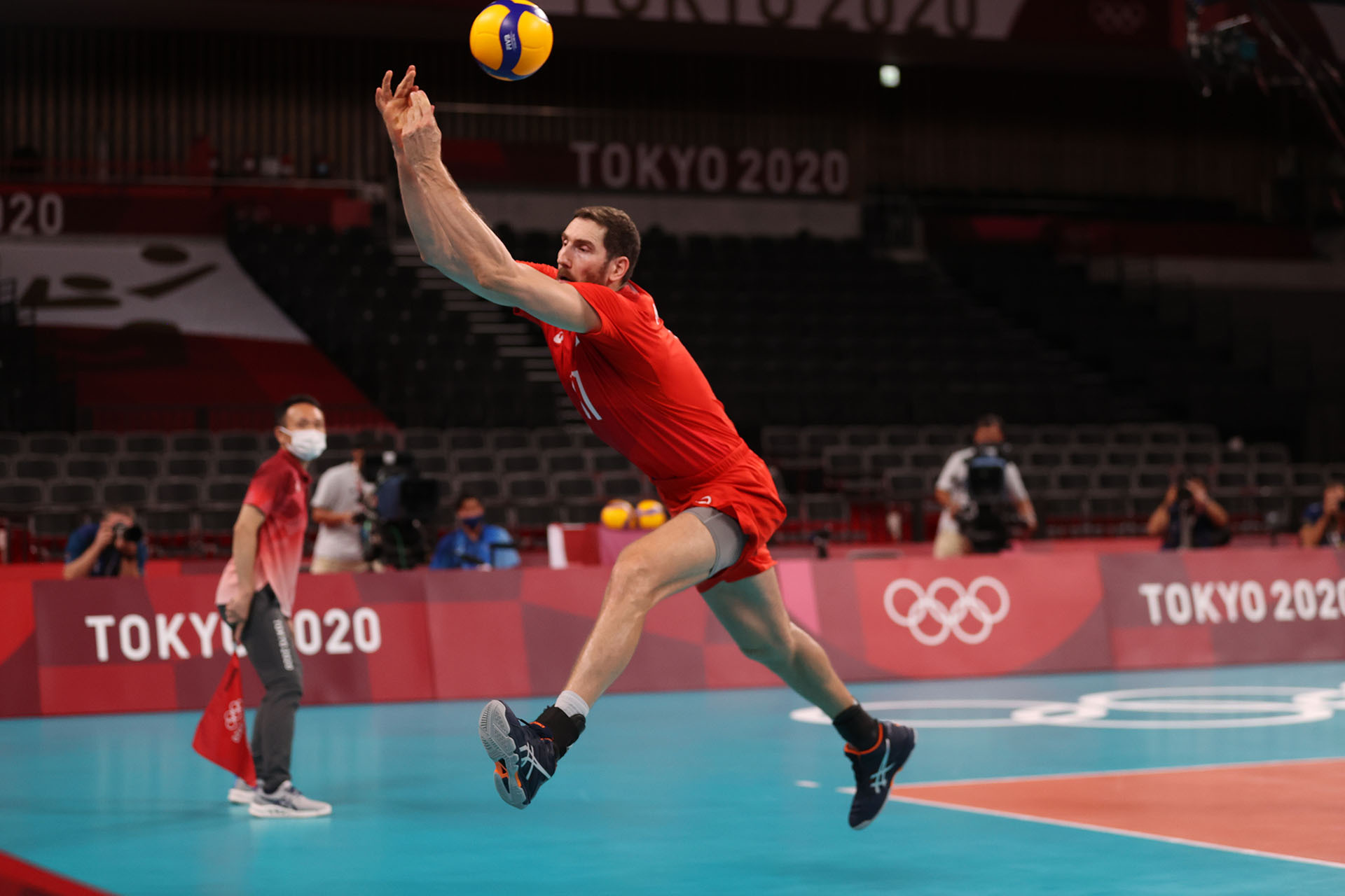 Valentin Golubev dives for a line serve/Ed Chan, VBshots.com