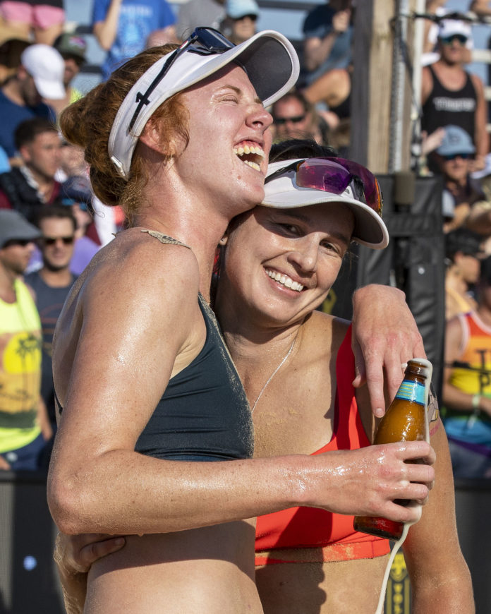 Kelly Cheng, left, and Betsi Flint after winning AVP New Orleans in 2022/Rick Atwood photo