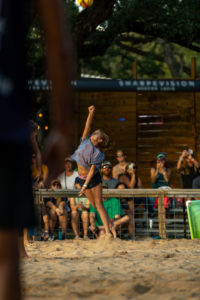 In particular, Moontower Saloon was abuzz with admiration for 17-year-old setter Thomas Hurst of the Dallas men’s team and 2018 University of Oklahoma grad Alyssa Enneking of the Third Coast women’s team from Houston. Hurst was giving off serious Partain brother vibes as he quarterbacked his Dallas team to victory in the preliminary round and battled against eventual champs Team AVP Hawaii in the semifinals. Plano West, where Hurst attends high school, doesn’t have a men’s team, and he hasn’t committed to play in college (John Speraw? Dan Friend? John Kosty? Anybody looking for a setter for the 2023 season?). But that lack of opportunity doesn’t seem to have slowed his development much. He credits that fact to his parents, who both played volleyball in college at George Mason.