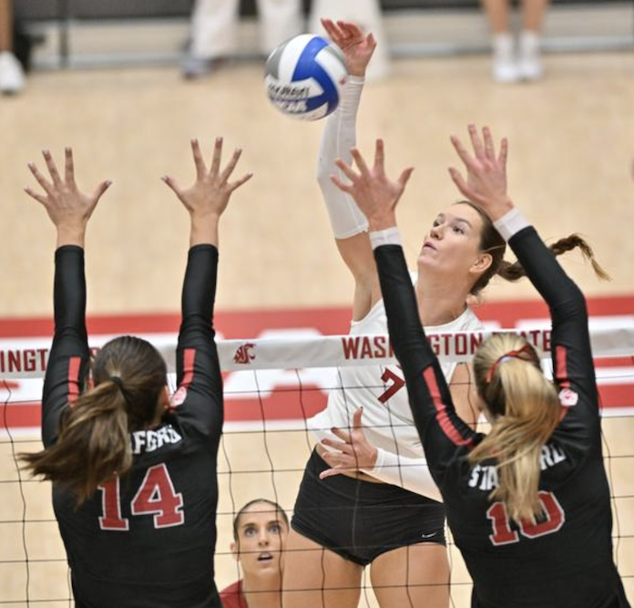 Iman Isanovic and Katy Ryan had 14 kills each for Washington State, which had won 14 in a row. Isanovic had an assist and 14 digs, while Ryan hit .391 and had two blocks and a dig. Pia Timmer had 11 kills, an assist, three blocks and eight digs, and Magda Jehlarova had 10 kills, three digs and six blocks, one solo. Setter Argentina Ung had four kills, 42 assists, a block and 17 digs. Her team hit .211 …