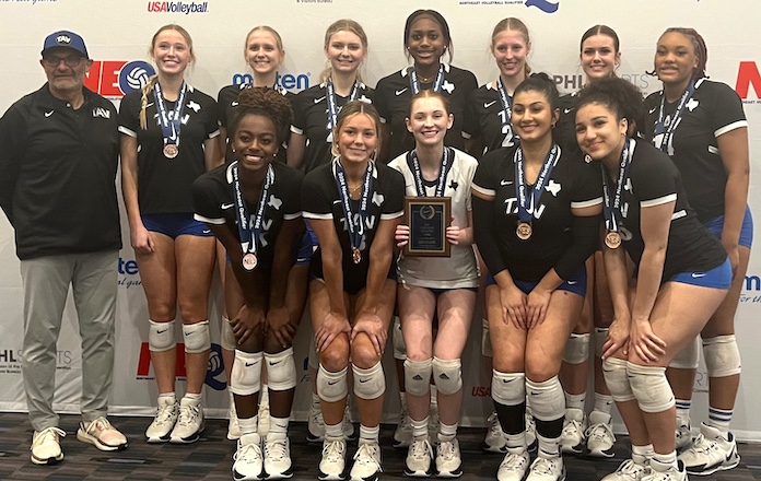TAV secured its bid through a “very collaborative team effort,” Haroun said. 17 Black had strong 6-rotation play and consistent hitting from left sides Emma Sorensen and Karli Jordan. There was a huge block and key hitting from Florida commit DeAndrea (Dee) McMillian in the middle and Old Dominion commit Katie Rakoski on the right. Libero Sophie Bridges and setters Kianna Babaei and Ryleigh Davis also were instrumental in getting TAV to Baltimore.