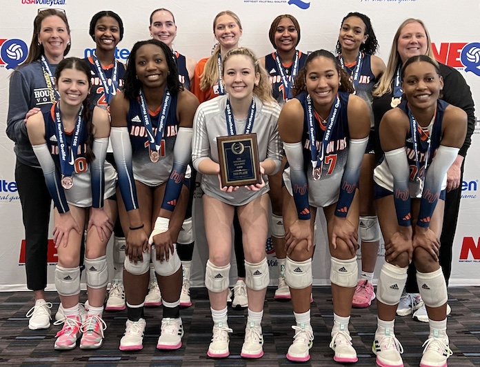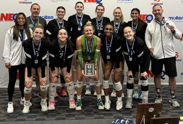 Surfside, which “arrived” last year by winning the Elite 16s division at Triple Crown, had a slow start to 2024 due to injuries and finished 18th at Triple Crown, but it traveled to NEQ with a full squad and showed a glimpse of its potential. The team finished second despite seeing MB Kalyssa Blackshear suffer an ankle injury early in the tournament. She powered through and so did the team, which benefited by the strong scoring arm of OH Kaci Demaria, solid passing from Simone Roslon and extreme digs from libero Olivia Foye. Newcomers Addy Benefield and Ruby Cochrane added size and more scoring options at the net and middles Blackshear and Daniela Rusich stepped up at key moments to help Surfside finish matches.