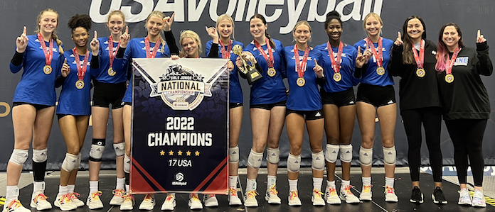 “Our semifinal match [against IowaPowerPlex 17U Black] motivated the team even more,” Thebeau said. “The team we faced was from our region, and we had lost to them in bracket play back in regionals! We knew it was going to be a massive task but having that tiny bit of motivation behind us pushed through the first set. Once the team could feel the finals, there was no slowing them down in the second set!”