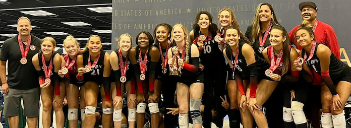 Dynasty was the No. 1 seed and top team nationally most of the year and probably expected to be atop the podium. Cassie Rockers’ team lost two, three-set matches on Day 1 to shake them. Dynasty then swept six tough teams in a row, including Colorado Juniors 16 Sherri, OT 16 T Jason, Metro 16 Travel and NKYVC 16 Tsunami, and was on a roll before falling to A5 in the semifinals.