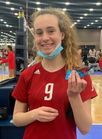 His club’s 16s team is very good and capable of drawing their own attention. The team is playing Open at the Sunshine Volleyball Classic this weekend and went 2-1 today to advance. The team boasts two big hitters, 6-3 RS Maddie Snider and 6-0 OH Ali Waldon, and a 5-8 freshman setter, Naomi Chinchar, for whom the club director has a particular fondness.