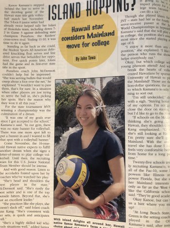 • Finally, I am spending a few hours every day cleaning out our house in preparation for remodel and sale. Today, I came across old copies of “Student Sports Magazine,” where my national coverage of volleyball began. I flipped one open from May, 2002, 19 years ago, to find a feature on Kanoe Kamana’o, the junior setter who’d led Iolani School to its first Hawai’i state title just a few months before. Kamana’o talked about being recruited by 25 schools and wanting to go to the Mainland for college.